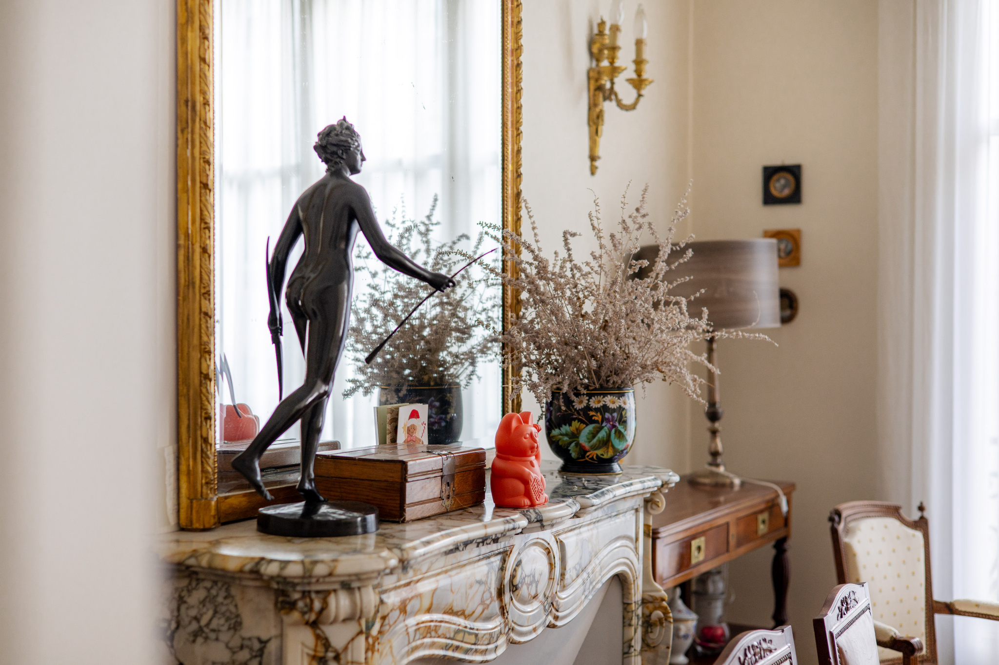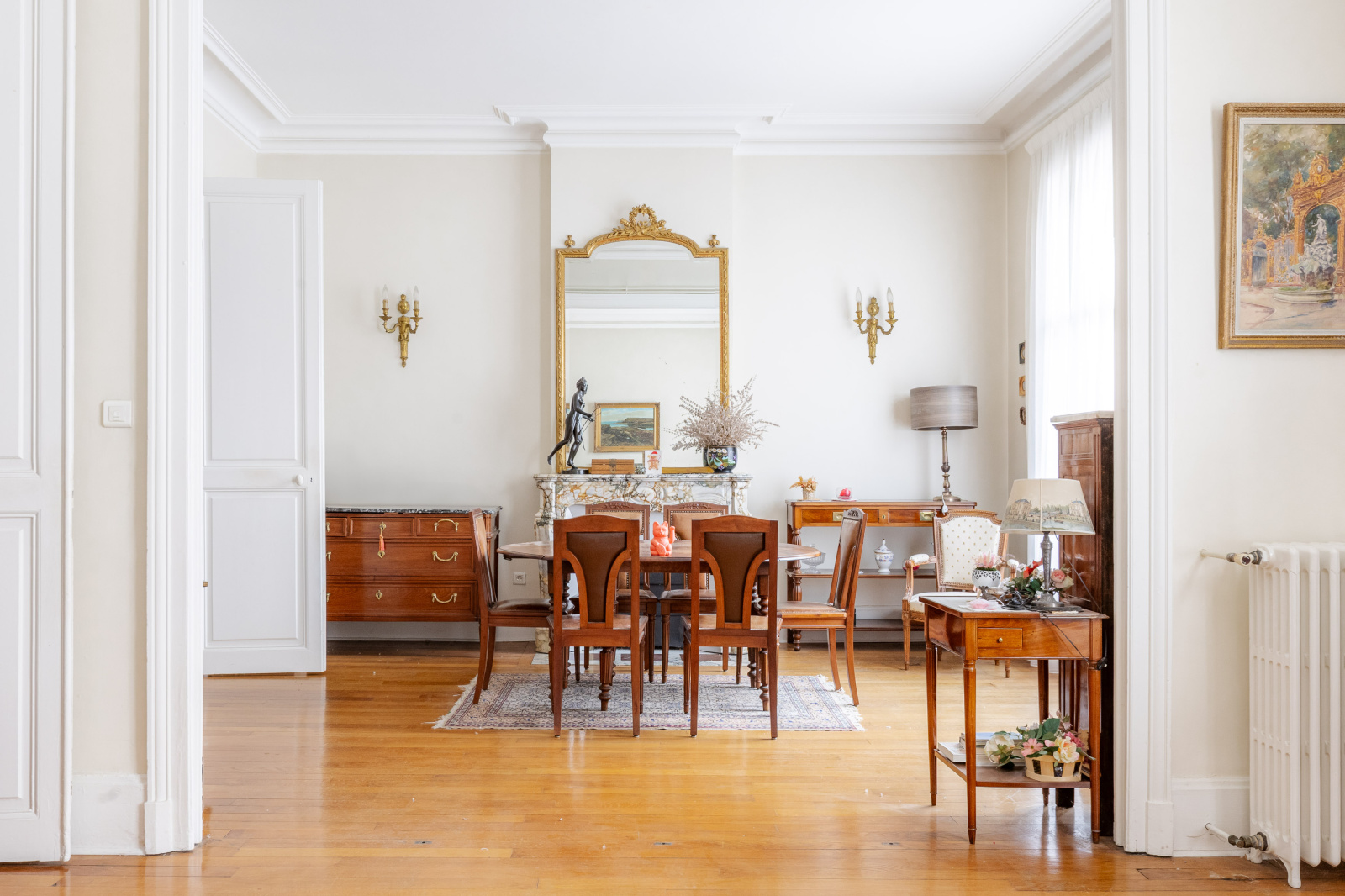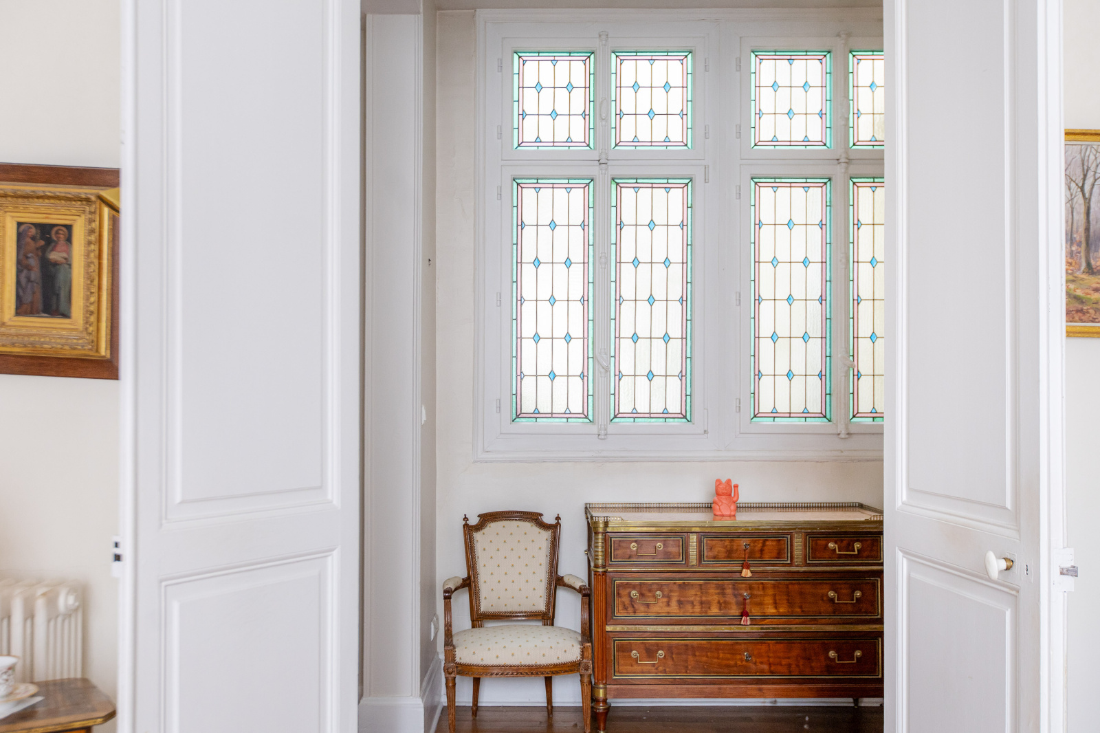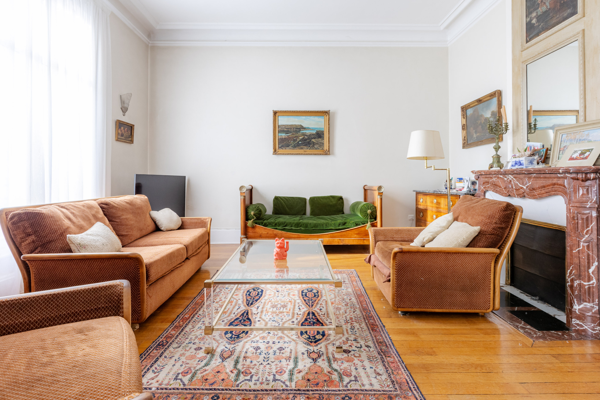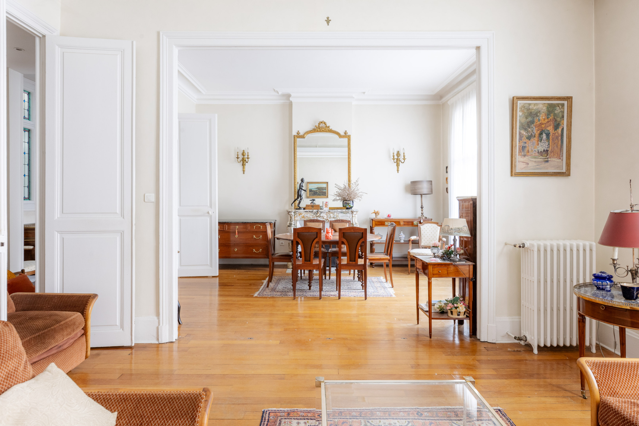 Vous y retrouverez tout le charme de l’ancien : parquets massifs, moulures, cheminées en marbre, vitraux et belle hauteur sous plafond. L’appartement bénéficie également d’un balcon donnant sur la rue.