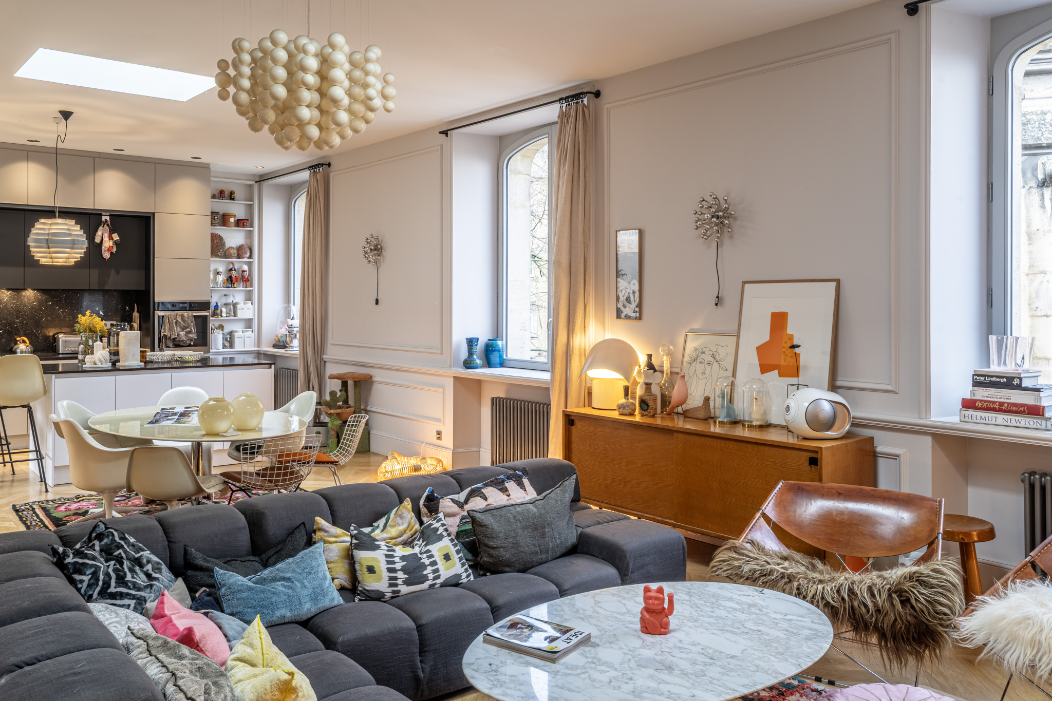 Une pièce de vie traversante spectaculaire, sublimée par une luminosité omniprésente, offre des volumes remarquables et une atmosphère à la fois élégante et contemporaine.