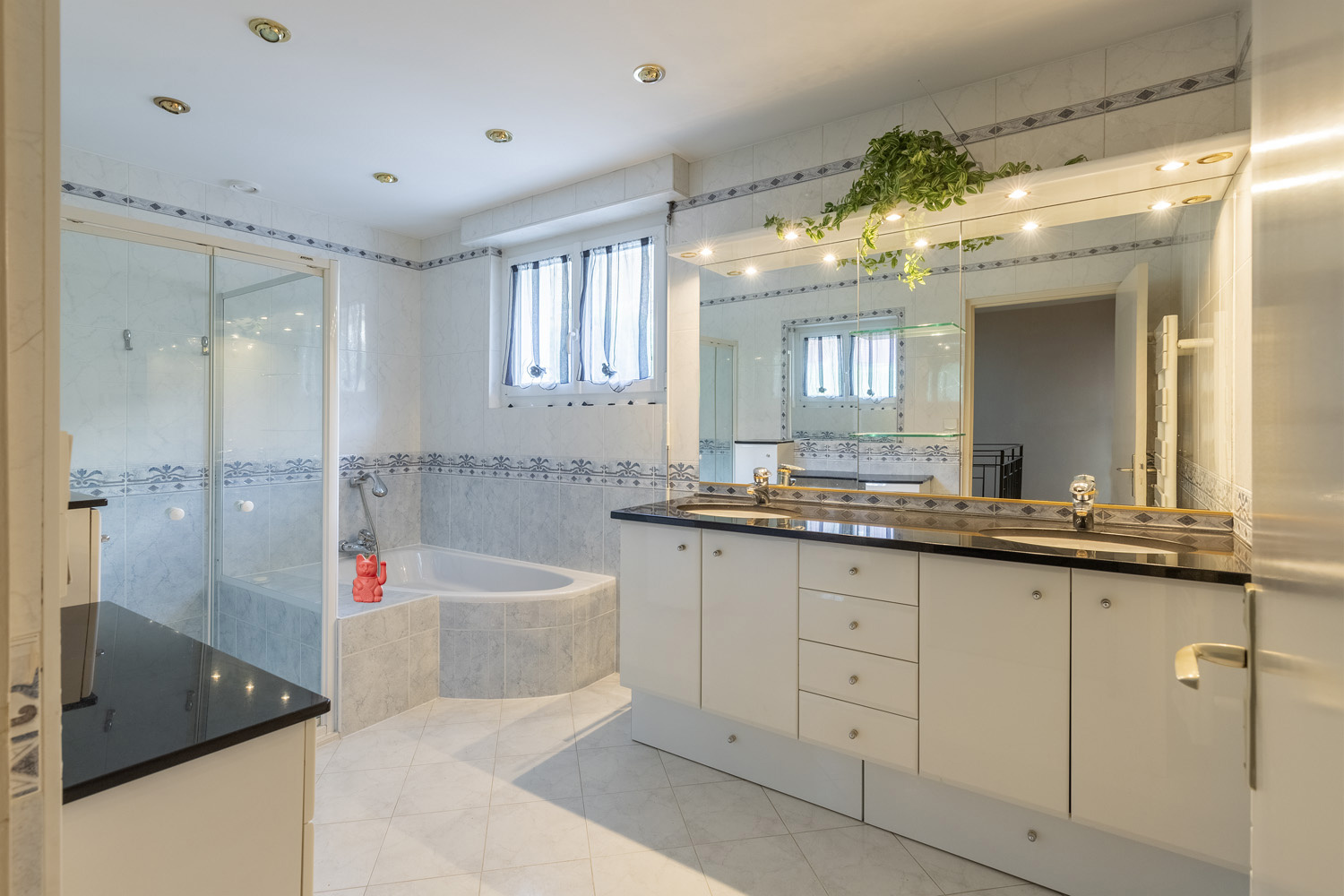 À l’étage, le palier dessert un vaste salon-séjour baigné de lumière et une cuisine équipée ouvrant directement sur la terrasse et le jardin. Trois chambres, une grande salle de bain, un dressing, une buanderie et un WC indépendant composent également cet étage.